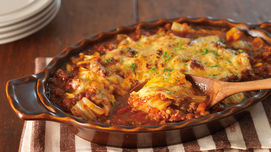 どっさり白菜もペロリと食べられてしまう、ミートソースのグラタンです。みじん切りのごぼうがボリュームアップの立て役者としてよい仕事をしてくれますよ。