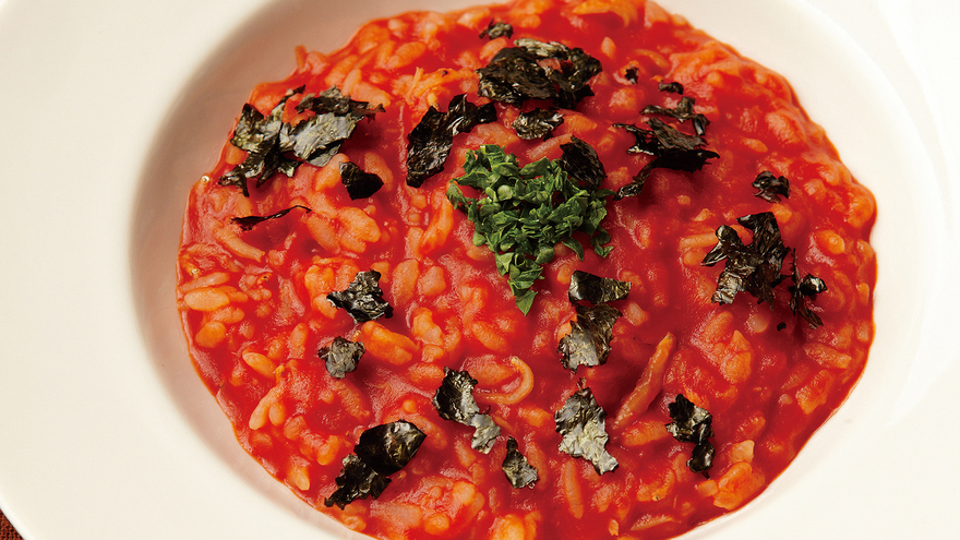 ご飯がトマトジュースを吸ってふくらむので、少量でも満腹感が得られます。うまみのポイントは、しらす干しともみのり。簡単でヘルシーな一品です。