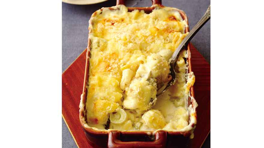 グラタンソースの中でも、シャッキリ歯ごたえの干し野菜は存在感を失いません。ねぎのやさしい甘みを堪能(たんのう)しましょう。