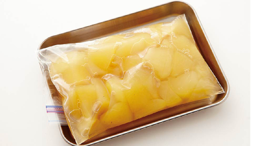 少し残ったシロップごとジッパー付きの保存袋に入れ、冷凍庫で1週間、冷凍庫で1か月間保存できる。