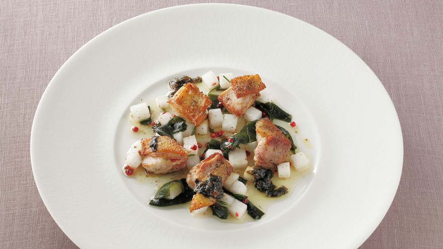 カリッカリに焼いたチキンにレーズンの風味あふれるわかめバターをかけていただきます。ローズマリー風味の大根がアクセントです。