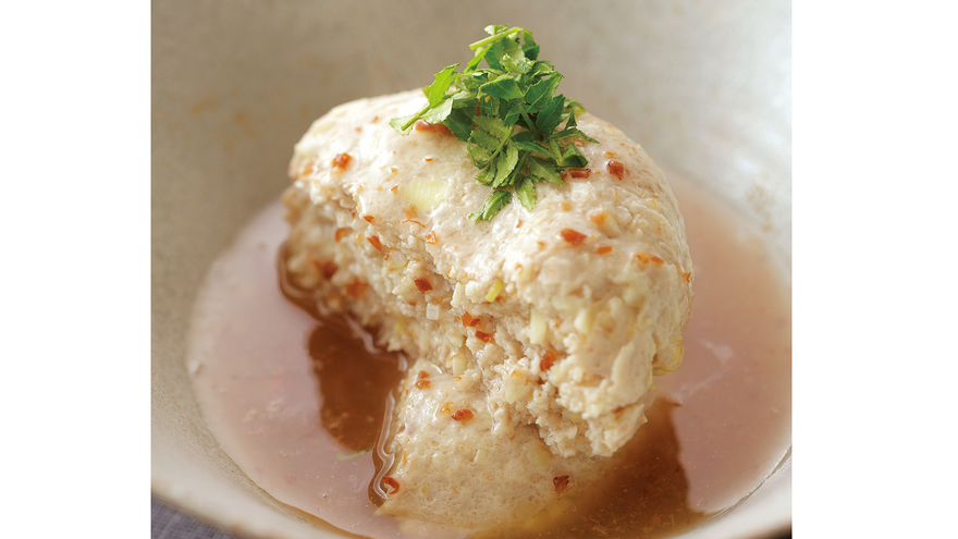 鶏肉と豚肉を合わせふんわりと柔らかく仕上げ、生のまますりおろしたたけのこを加えたたけのこ風味のハンバーグ。さっぱり梅あんをかけます。