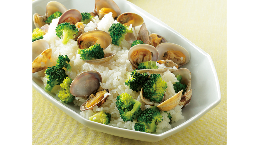 1に【A】を加えて混ぜ、2のあさりを汁ごと加えて普通に炊く。その間にブロッコリーを小房に切り分け、塩少々を入れた熱湯で堅めにゆでてざるに上げる。