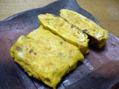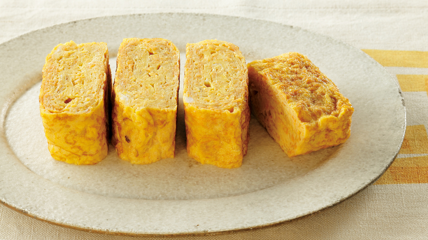 卵焼き器にサラダ油を薄く塗って中火で熱し、2を3~4回に分けて流し、そのつど、半熟状になったら手前側に向かってクルクルと巻く。
