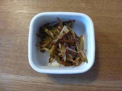 サラダ油を熱したフライパンで強火でしんなりと炒め、砂糖、しょうゆ、赤とうがらしを加え、汁けがなくなるまで炒める。