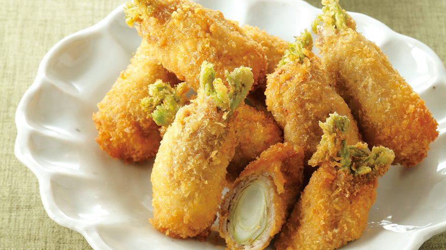 たらの芽を豚肉で巻いて、かわいらしいカツに仕上げます。 ソースではなくレモンを搾って、たらの芽の香りを味わってください。