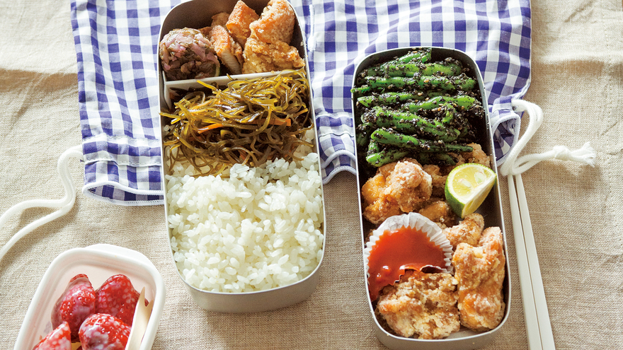 冷めてもおいしい鶏のから揚げ。ごまあえや煮物など、副菜も定番で固めました。