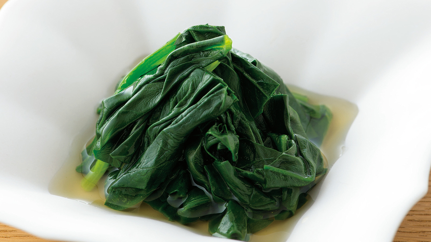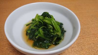 だしによって野菜の風味が引き立つ、おひたしです。 小松菜や春菊、水菜などの葉野菜や焼きアスパラガスなどでもおいしいです。