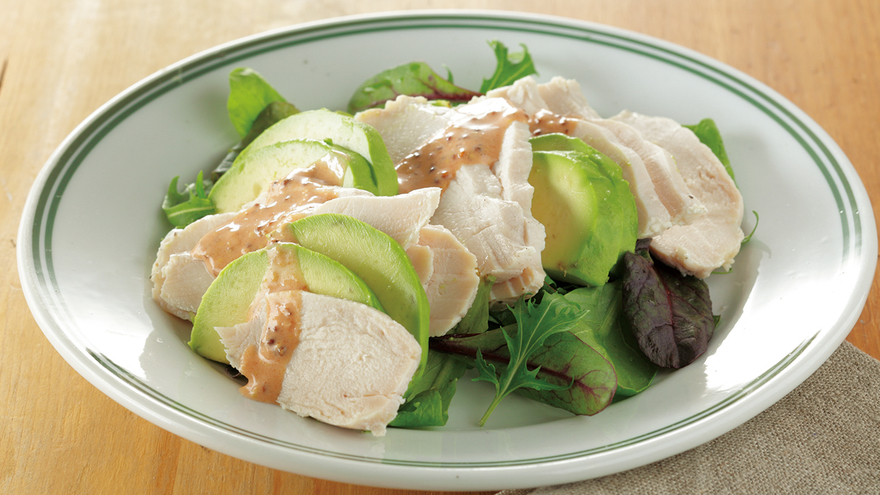 鶏ハムとアボカドに、粒マスタード入りのドレッシングがアクセント。