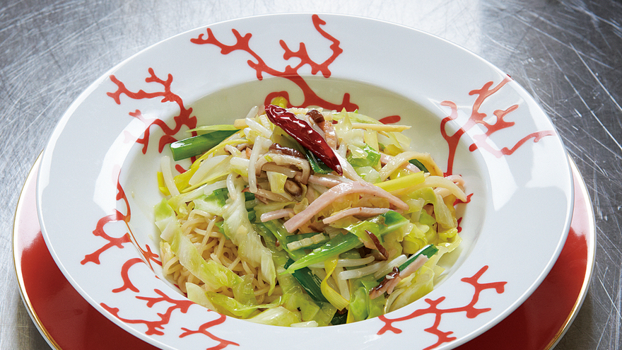 野菜がしんなりしたら、スープ50ml、酒・しょうゆ各小さじ1、塩・こしょう各少々を加えて全体にからませ、器の麺の上にのせる。