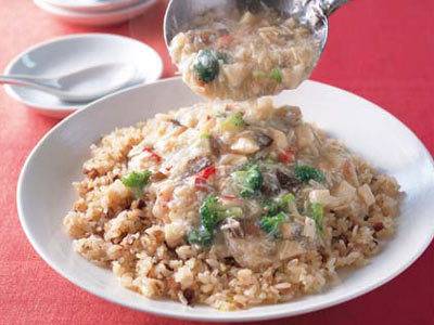3のチャーハンを器に盛り、4の【あん】をかける。