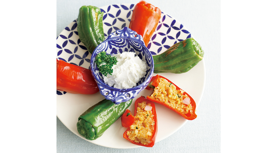 3のピーマンに2のケチャップライスをティースプーンなどでしっかりと詰め、ヘタでふたをして、器に盛る。ヨーグルトクリームとパセリ(分量外)を添える。