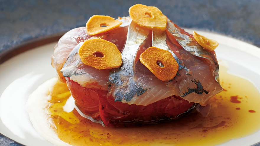 焼きトマトとあじのアンチョビソース
