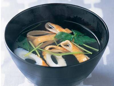 ちくわは斜め薄切り、みつばは3cm長さに切る。庄内麩はぬらしたふきんで包み、約5分間おいて柔らかくなったら8mm幅に切る。