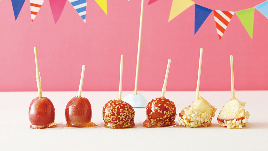水あめではなく、べっこうあめ風のパリッとしたあめがけです。水分の出にくいりんごや、 皮に覆われたぶどう、ミニトマトでつくります。
