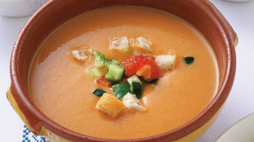トマトなどの生野菜とパンをミキサーにかけた冷製スープは、のどごしがよく、栄養満点!できれば一晩ねかせると、味に深みと一体感が生まれます。