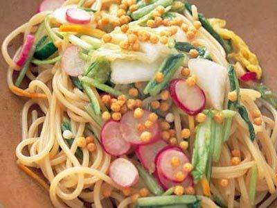 1の漬物を加えて、スパゲッティのゆで汁と塩で味を調え、ゆで上がったスパゲッティを加えてよく混ぜる。