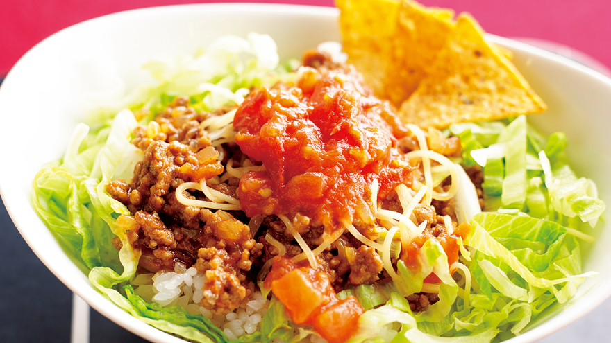 ご飯にメキシコ料理のタコスの具をのせた沖縄名物のタコライスをつくりやすくアレンジ!ソースの辛みはお好みでどうぞ。