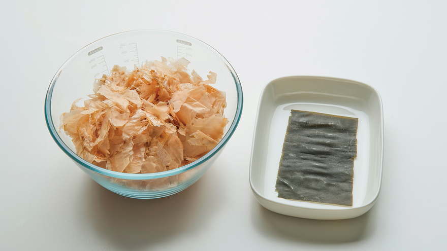 そのまま火にかけ、沸騰する寸前に昆布を取り出して削り節を加える。