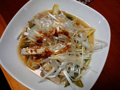 鶏肉を取り出し、1cm幅のそぎ切りにする。器に蒸したねぎ、鶏肉、白髪ねぎ、赤とうがらしの順に盛り、【A】をかける。