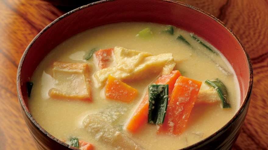 酒かすは、米と米こうじを発酵させた「もろみ」から、酒を搾り取ったあとの固形物。主役の酒よりも栄養価が高く、コクと甘みがあります。かす汁は、これと白みそをベースにして普通のみそで味を調えると、まろやかで、どなたにも飲みやすく仕上がります。
