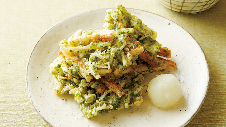 揚げ油を170℃に熱し、4をしゃもじに適量のせてすべらせながら入れる。周りが固まったら裏返し、合計3~4分間揚げる。器に盛り、大根おろしと【天つゆ】を添える。