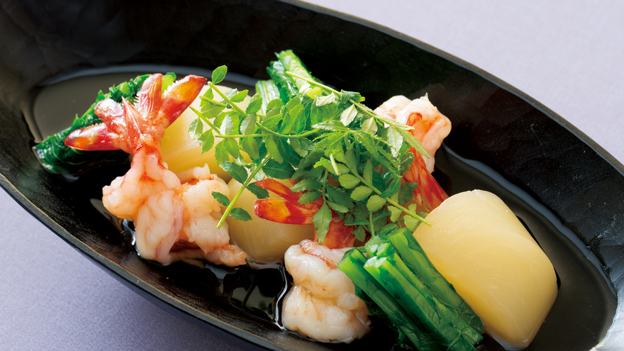 鍋に煮汁【B】を入れて沸騰させ、えびを加えて火を通す。