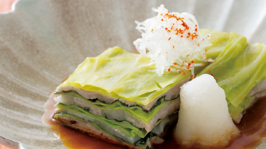 博多帯のしま模様みたいなので「博多」蒸し。庶民派だと思われがちな豚こまも、工夫次第でこんな上品なおかずに変身します。