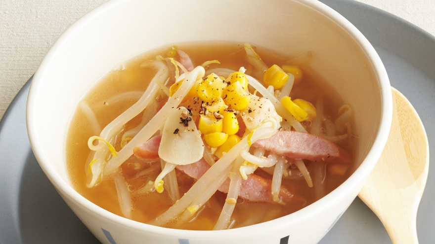 【A】を加えて中火で1分間くらい煮立て、1のソーセージとコーンを加える。1分間くらい煮て、みそ大さじ1~1+1/2を溶き入れる。