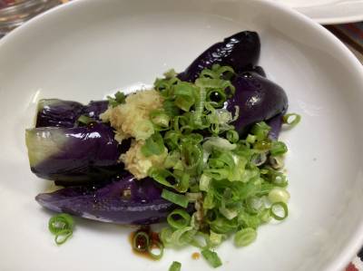 揚げなす2〜3コ分を器に盛り、しょうが・青ねぎ各適量をのせ、しょうゆ少々をかける。