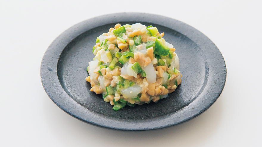 ネバネバ納豆とオクラに、いかを合わせた人気の味。そうめんによくからんで、めんつゆやごまだれとも相性バツグン!