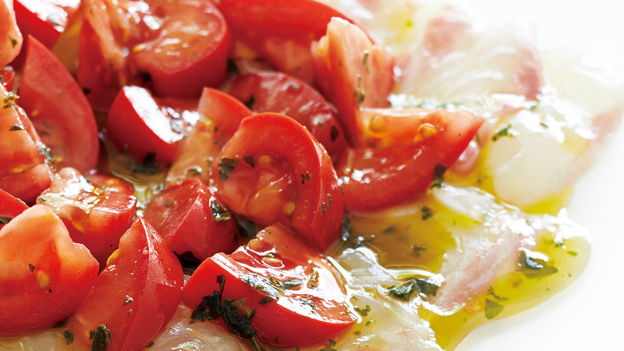 香り高いバジルペーストをつかった白身魚のカルパッチョ。消化促進作用もあるので夏の食欲不振に。