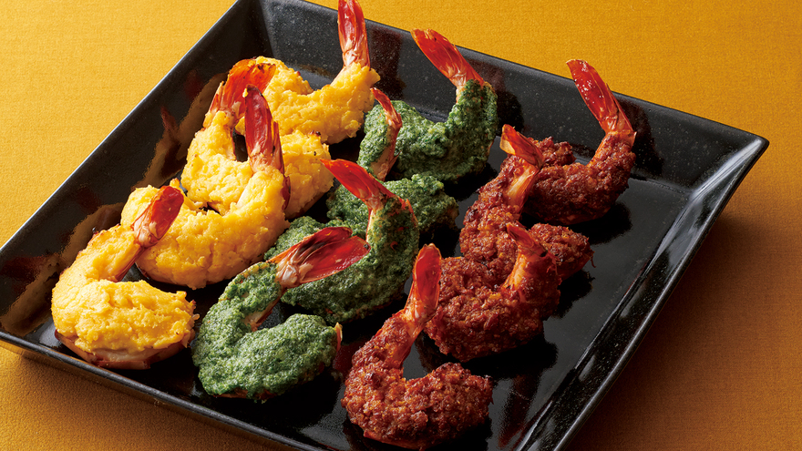 お正月にえびを食べるのは、えびのように腰が曲がるまでの長寿を願ってのこと。そんなお正月の定番を洋風にアレンジ。3色のペーストで華やかに仕上げたえびは、子どもから大人まで大好きな味で、お重に詰めても、大皿で出しても喜ばれること間違いなしです。
