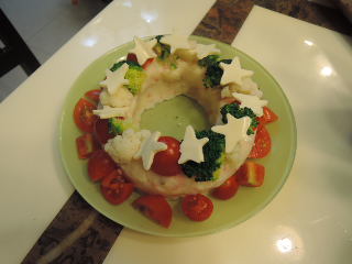 いつものポテトサラダも、リング状にまとめてゆで野菜で飾れば、クリスマスのごちそう風。