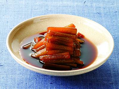 ほろ苦く、シャキシャキしたふきのおかず。しょうゆの風味が一体となって、ご飯にぴったりの一品です。
