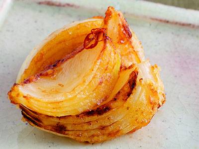 新たまねぎは6等分のくし形に切り、かたくり粉適量を表面にまぶす。