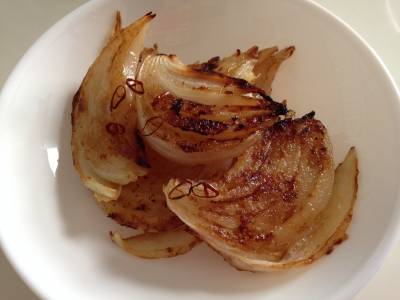 時々ふたを取り、焼く面を返し、5分間ほど蒸し焼きにする。ふたを取って、しょうゆ大さじ1/2を回し入れ、新たまねぎにからめて火を止める。器に盛り、赤とうがらしを散らす。
