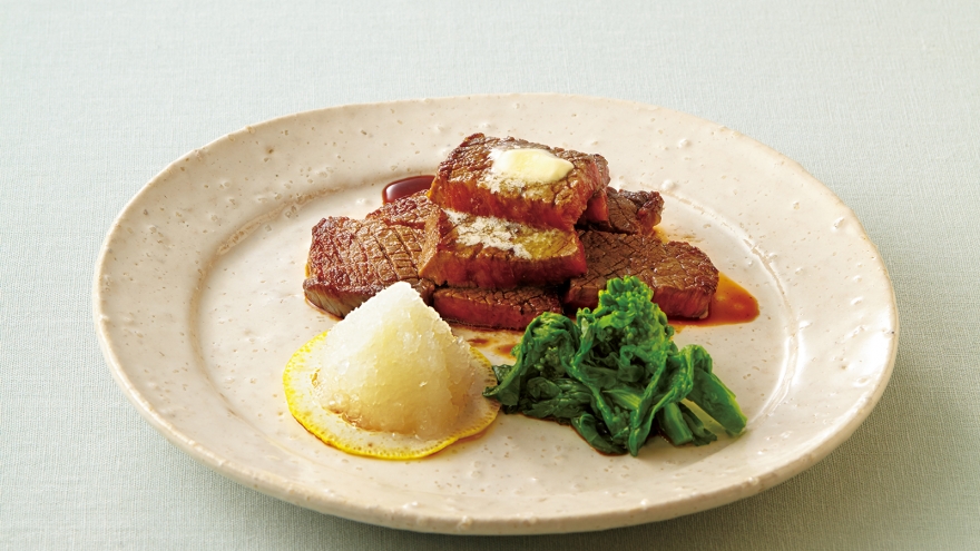 しょうゆとバターの香りとコクを添えたステーキに、さっぱり大根おろしをのせて味のハーモニーを堪能しましょう!