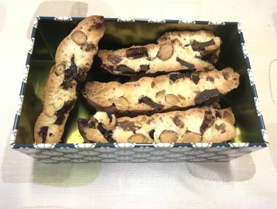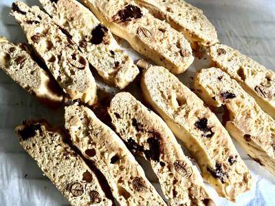 ビスコッティは、本来は油分を入れずにつくりますが、このレシピは油を加えて柔らかくさせ、食べやすい堅さに仕上げます。油は、ごま油(白)を使用。くせがないので、ビスコッティの風味を損ないません。