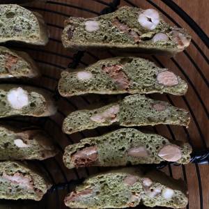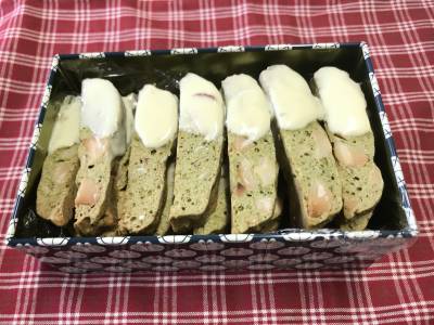 マカダミアナッツと抹茶を混ぜて、仕上げにホワイトチョコでコーティングすることで、味と食感の変化が楽しいビスコッティができあがります。紅茶や日本茶にもピッタリです。