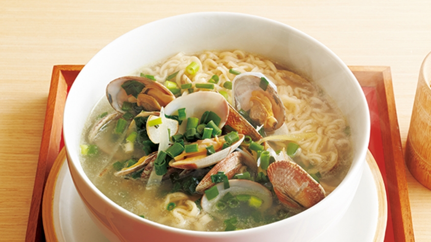 あさりのだしが加わって香味野菜がたっぷり入った、あっさり味のスープ。ねぎ油で香りとコクをプラスすると、即席ラーメンの実力を見なおす1杯に。