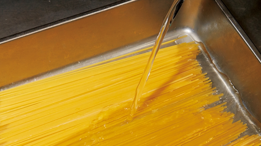 乾燥のスパゲッティをあらかじめ水につけて戻しておくのは、レストランの裏ワザ時短テクニック!時間のあるときに水づけにしておけば、思い立ったらすぐつくれるのも魅力的です。