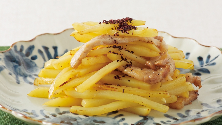 新じゃがいものせん切りをシャキシャキの食感に炒めます。赤じそふりかけの風味がよいアクセント。