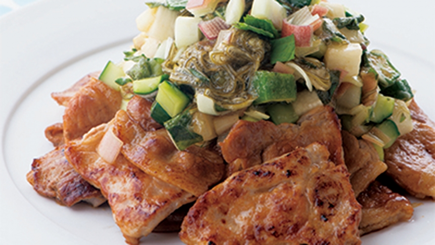 フライパンにごま油小さじ1を中火で熱し、1の豚肉の汁けをきって入れ、両面を色よく焼く。器に盛り、3をかける。