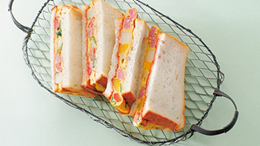 切り口からカラフルな野菜が顔を出します。見た目も味も、元気になれそうな具だくさんサンドイッチです。