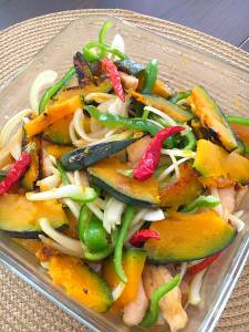 かぼちゃは横半分に切り、5~7mm厚さのくし形に切る。たまねぎは薄切りにして水にさらし、水けをきる。赤ピーマンはヘタと種を取り、横に細切りにする。