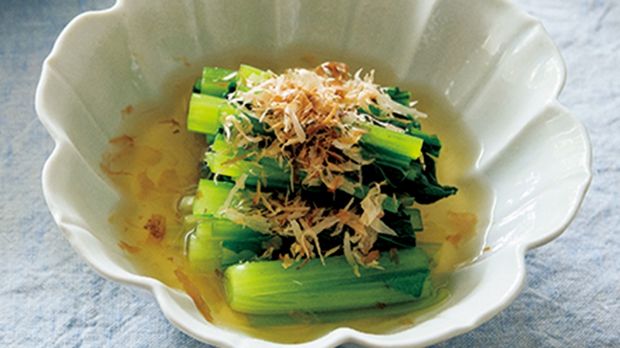 【合わせ地】の味がよくしみるように、しっかりと水けを絞る。ただし、小松菜がつぶれてしまわないように気をつける。