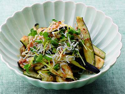 ボウルになすを入れ、【A】を加えてあえる。しらす干し、貝割れ菜、削り節を加えて混ぜ合わせ、塩少々を加えて味を調える。