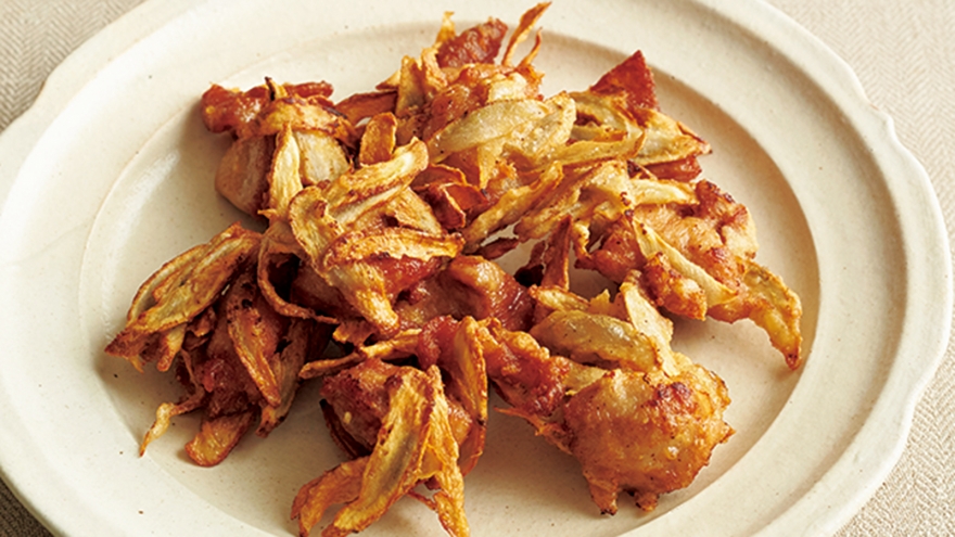 鶏のから揚げとごぼうチップスが合体した、カリッとスナック感覚の一皿。香りと歯ざわりで肉の存在感をごぼうが効果的に引き立てます。