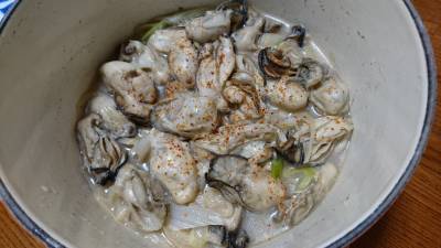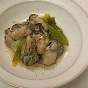 ねぎにかきのうまみがじんわり。ほんのりバターの香りが食欲をそそります。蒸し汁はリゾットにしても楽しめます。